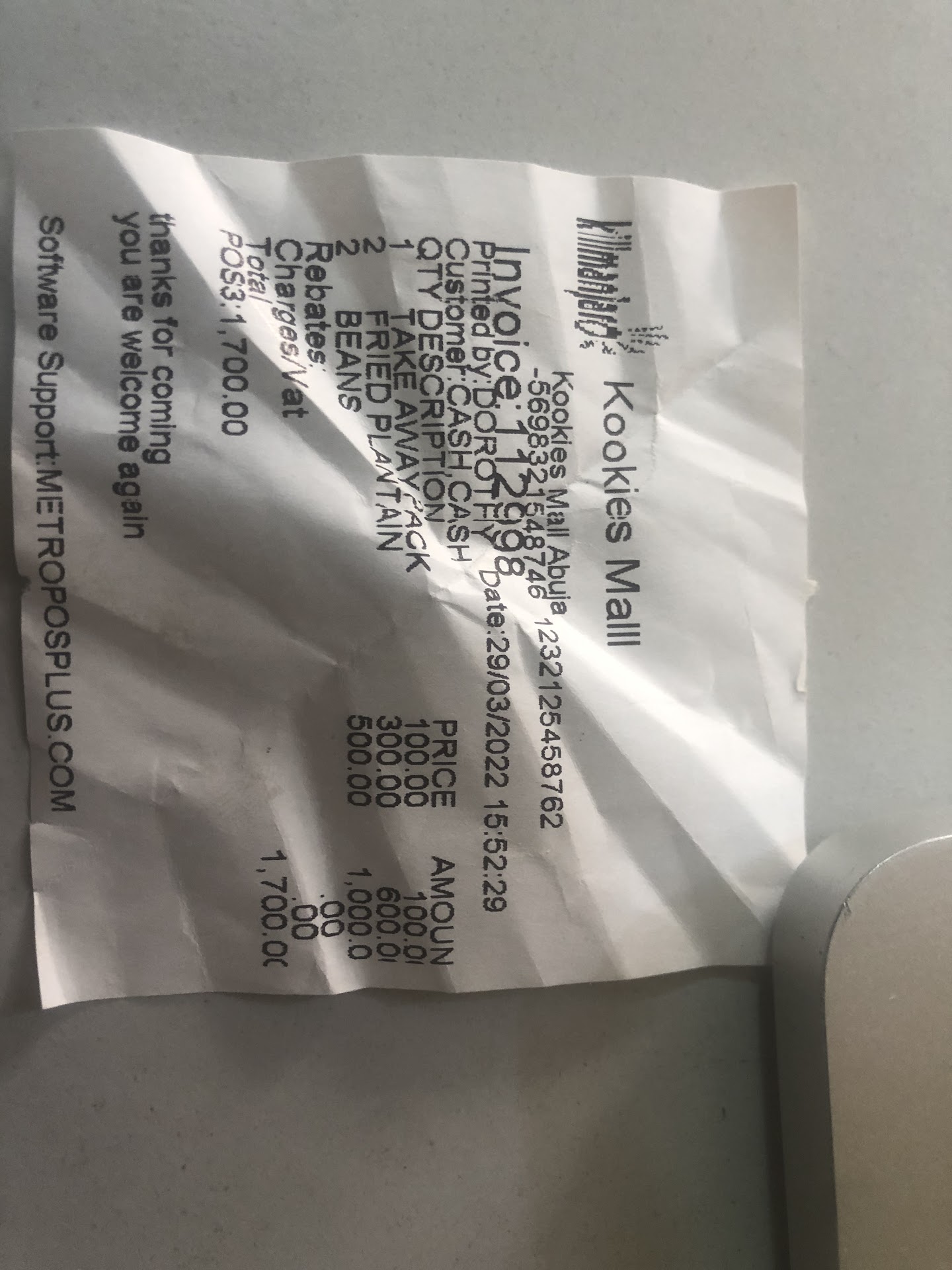 Today (29 March 2022 at about 3:52pm), I got a plate of beans (2 portions) and fried plantain (2 portions) from Kilimanjaro Restaurant at Kookies Mall, Wuse 2, Abuja. My receipt is attached.