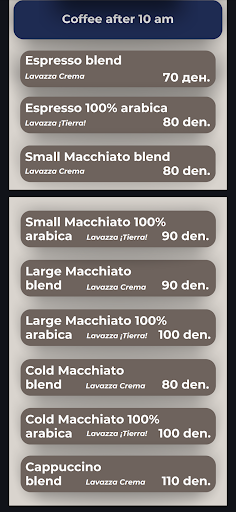 Read moreBest coffe in town. Price higher than other places , only 10 denari difference but much better coffe.