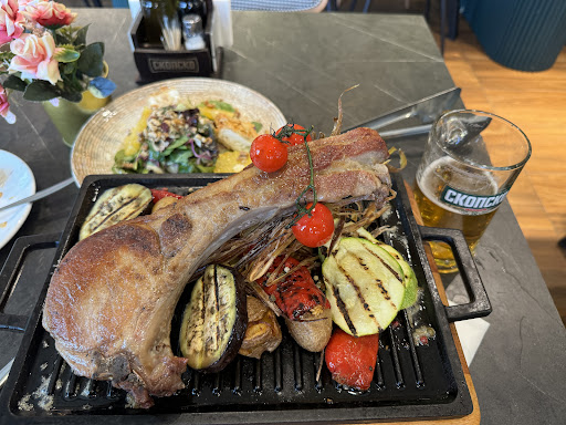 Grilled yellow cheese (not on the menu, two pieces for 180 denars) were nice, they tasted a little like the cheese bites you get at Burger King. Grilled chicken skewers with baked potatoes were tasty, although on the salty side. Potatoes were luke-warm. Grilled cherry tomatoes served with the chicken had turned cool. Toplo-ladno cake (aka molten lava cake) was also served luke-warm, the cake tasted a tad stale and the chocolate, cheap. Came with ice-cream on top of a full slice of orange which was awkward to eat with just a tea spoon. Either a knife needs to be provided or the cook needs to rethink the practicality of someone eating a round slice of orange under an ice-cream. A few pomegranate pieces scattered on the place were a nice addition. Generally good food and service, brunette waitress with glasses spoke perfect English and was warm and friendly. Comfortable place to sit and eat in terms of seating, tables, space but they allow people to smoke which was very off-putting. BAN SMOKING INDOORS! ITS A DISGUSTING, DANGEROUS HABIT! NO ONE WANTS TO INHALE (SECOND-HAND) SMOKE BEFORE/DURING A MEAL!!! Also, music was pretty loud. Don't know what it is about loud (usually pop) music in all venues but seriously, businesses in the Balkans need serious lessons on...