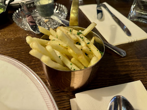 I ordered the fries because I was genuinely curious what fries would look like at this admittedly very fancy looking establishment. Once presented to me I was a bit disappointed, but I blame myself. Quickly I asked the waiter for a sauce or ketchup to dip my fries, anything really. I was met with a look of confusion and smirky “we don’t serve that here” I laughed because that’s funny but dam I guess my sad fries will have to do. I’m trying to be nice but they were half cold as well, probably sitting out since their existence is a low priority in this fancy restaurant. It was starting to feel like I’m not the customer they want to please lol.