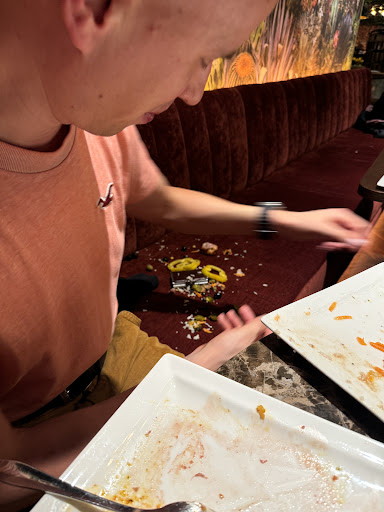At 21:09, one of the waiters came with the meat and accidentally dropped our plate on the couch over our gore jackets 🧥 which got damaged, after that we did not eat anymore and because the night simply got wasted!