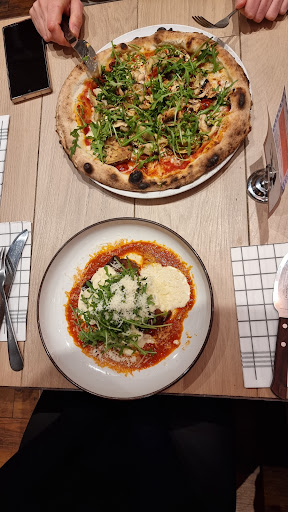 Restaurant: some seating outside. Inside it's a bit bad acoustics, so it's a bit noisy, but it feels authentic Italian. It's open kitchen where you can see the wonderful chefs making amazing food. Notice the clothes that someone hung up!