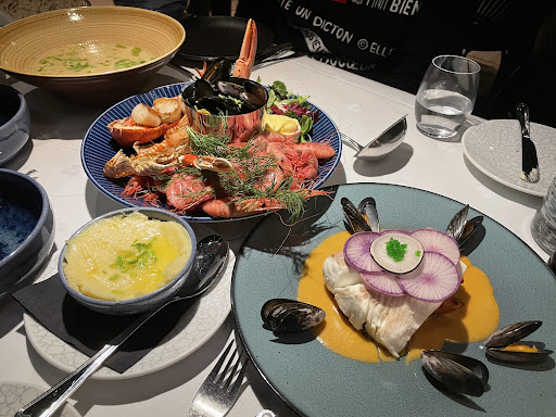 Fish soup was creamy and great. Highly recommend this dish. Seafood platter includes cooked 1/2lobster, crawfish, scallops, mussels and fresh shrimps. I didn’t like the mussels but the rest was fresh and great! Comes with mashed potato, rich and creamy!! Love it.