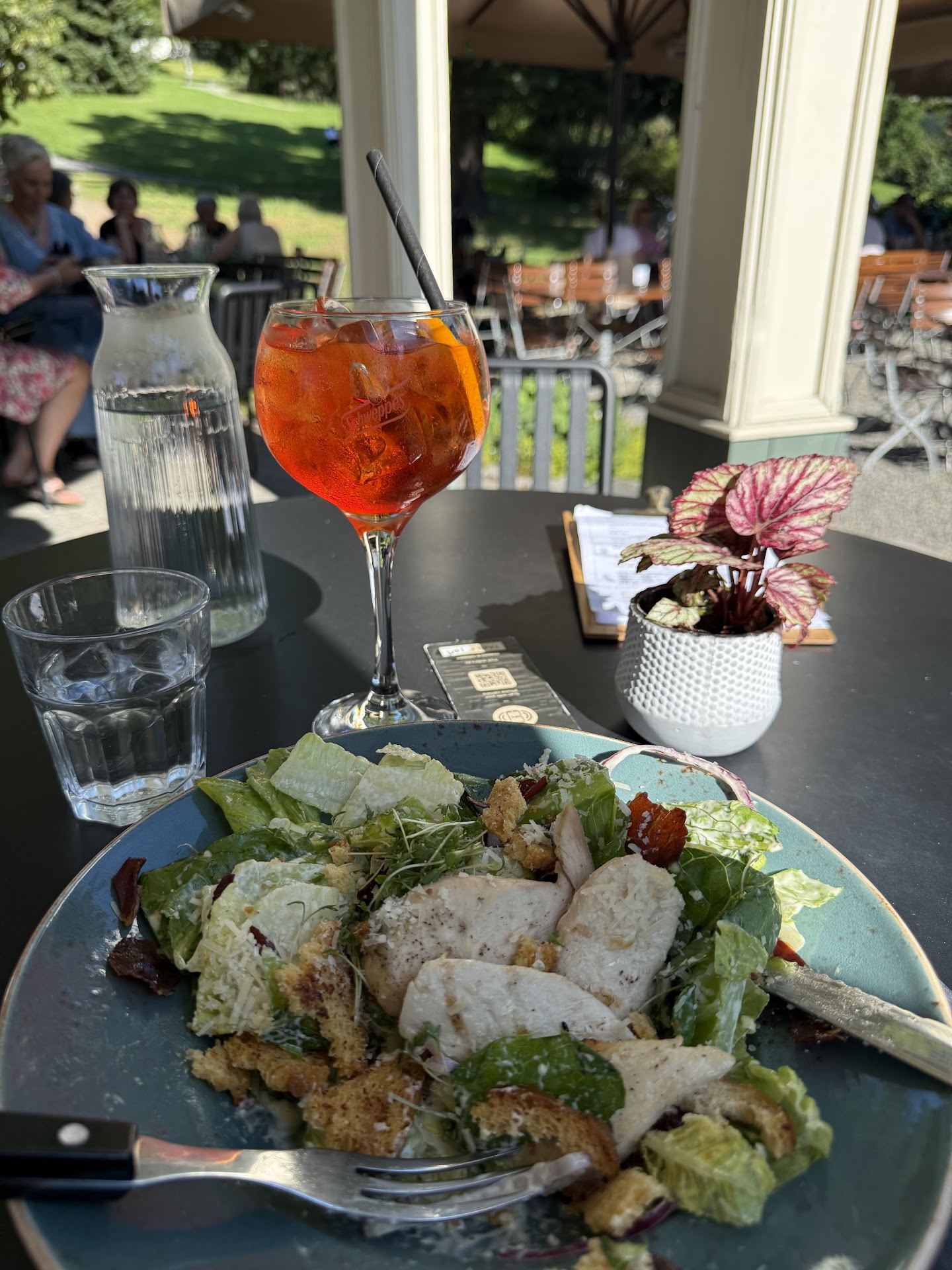 I ordered the mozarella salad with ovenbaked veggies. Honestly, I didn't expect much, but was blown away when the food arrived. The mozarella was served on a bed of onion, garlic cloves, zucchini(I think) and paprika. The cheese was "opened" and filled with olives, covered in pesto, olive oil and sunflower seeds. It was DELICIOUS. 5/5, 10/10. Also had a delicious aperol spritz mocktail. Affordable prices. Why haven't I been...