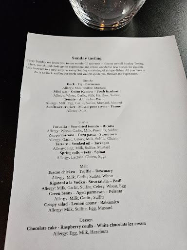 Not recommended! The service was great, or at least our server was very informative and attentive and engaging in helping us having a good dining experience. Drinks were also great! However, the food was not that great. We bought the tickets to the 13-course Sunday Tasting and we concluded that the main problem of the food was the lack of balance. We informed the kitchen that we are very sensitive to overly salted food and they were trying their best to accompanied that. The first serving was great, which consisted of 4 different small bites/snacks. The watermelon tart was the best, and honestly, that is the only single bite that we thought was good and delivered in flavour. The dinner was just going downhill from there. The next serving are the appetizer or mellomrett. We started with a cold, rich seafood broth with mascarpone mousse. It was good but the broth was so condensed with seafood which make it naturally salty and hard to enjoy. The fried scallops were mediocre - the pickled fennel was actually better than the scallops themselves. The burrata tomato salad was very refreshing - great, sweet tomato and creamy burrata. And then a cauliflower dish - both of us were puzzled what exactly it role was because it was very unremarkable. The problem of unbalance started appearing from this serving - all 4 dishes were TOO rich, with excessive amount of cream and fat in total. We were almost full and lost most of our appetite after this serving, which was ridiculous because they were suppose to be appetizer. Then come our main dishes, which we disappointed the most. First was the porchetta, which was inedible for us because it was ridiculously salty. We informed the server and she made her best effort to make replacement. But the kitchen informed that there were no other meat dish to substitute (which is ridiculous because they serve meatballs and chicken on their normal menu everyday and it's not like everyone coming on Sunday will have a Sunday Tasting menu). So they gave us asparagus with beurre blanc sauce. The other mains are a homemade pasta dish - which was again covered in cream and cheese and was very hard to eat when it got cold, a risotto with truffle and cream and cheese (again) - the rice grain was a bit weird and it stick to our teeth constantly, and finally a mini corn dish with confit garlic sauce, which was the only thing we could finish in this serving. Everything was just cream and cheese, too much fat without anything to cut through so it was extremely hard to enjoy the food. The dessert was an olive cake with balsamic vinegar and strawberry compote, served with ice cream. The ice cream is great, I did not think the balsamic vinegar component worked but my sister liked it.