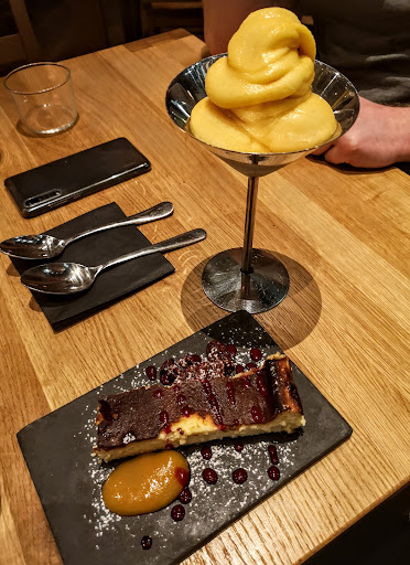 Were exploring the area near our Airbnb and decided to have dinner here. The decor is simple and slightly industrial with exposed brick walls and floor to ceiling windows, but the wooden furnishings and candles on the tables add warmth. We shared some great tapas, including a fried goat cheese and beetroot salad, empanadas, 'bikini' toast, perfectly cooked cod, patatas bravas and the intriguingly named 'roots', which turned out to be some yummy, roasted root vegetables. For dessert we had the sorbet of the day (mango) and the Catalan cheesecake. Not only was everything presented beautifully, but it was delicious too. I was really impressed with the professional and genuine service from our waiter, particularly when it came to paying the bill. I didn't get his name, but he is definitely a credit to the restaurant. Firstly, his explanation of how card payments work in Norway when I got confused was very helpful and polite. I wasn't aware it is the customer, not the server, who enters the amount. And secondly, when we asked if service charge was included (it wasn't) and were trying to work out the conversion to include a tip, he very kindly said we didn't have to because of the already high price of the meal compared to the UK. This simple gesture set him apart in our eyes. Anyway the bill, including tip, came to just over £100. This was our first meal on our first night in Oslo, and it set the bar high....