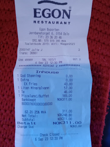 Read moreWe were in this restaurant on the weekend, I wish I hadn't gone there, we were cheated in payment, they counted our portions twice for what we ordered, the staff heard that we weren't speaking Norwegian and there were 2 waiters discussing us, and I understand a little Norwegian because I'm learning Norwegian now, I wanted to make a remark to them but my husband said don't pay attention, the second thing that surprised me and it's not acceptable when pizzas are open at the aisle and people walk past, it really amazed me, you should go to Ukraine or Lithuania or Germany, these are the countries that can be given first place in terms of how restaurants work there and how the staff works, like Swiss watches, they really train the staff very well and the waiters there serve food to people in special gloves, and the food is not in the open where someone can bring their germs there, such as tuberculosis. And in the end, as we were leaving, there was enough space, but people were standing in line at the aisle in the cold and not a single waiter responded to them and many simply left. The staff is not well-mannered, they do not know their job, they run around chaotically. This restaurant near the train station works on quantity and not on quality. My husband and I spent 1600 kroner for two and I came home, we live 20 minutes from the center of Oslo, I wanted to eat at home because I was not full there. I was a frequent visitor to different Agon places, but I will not go to this address anymore and I will not recommend it...