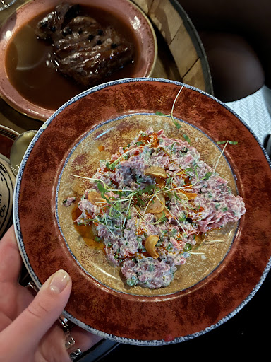 The food? Outstanding. Every dish we tried was a testament to both flavor and impeccable presentation. The starters were particularly memorable, with the chicken liver pâté and beef tartare stealing the spotlight. Moving on to the mains, the svineribbe and steak were incredibly well-executed—cooked to perfection and packed with flavor.