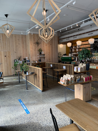 Not ergonomically designed cafe. More like deli style with big island table stocked with wide selection of coffee pouches for sale on floor and behind the counter.