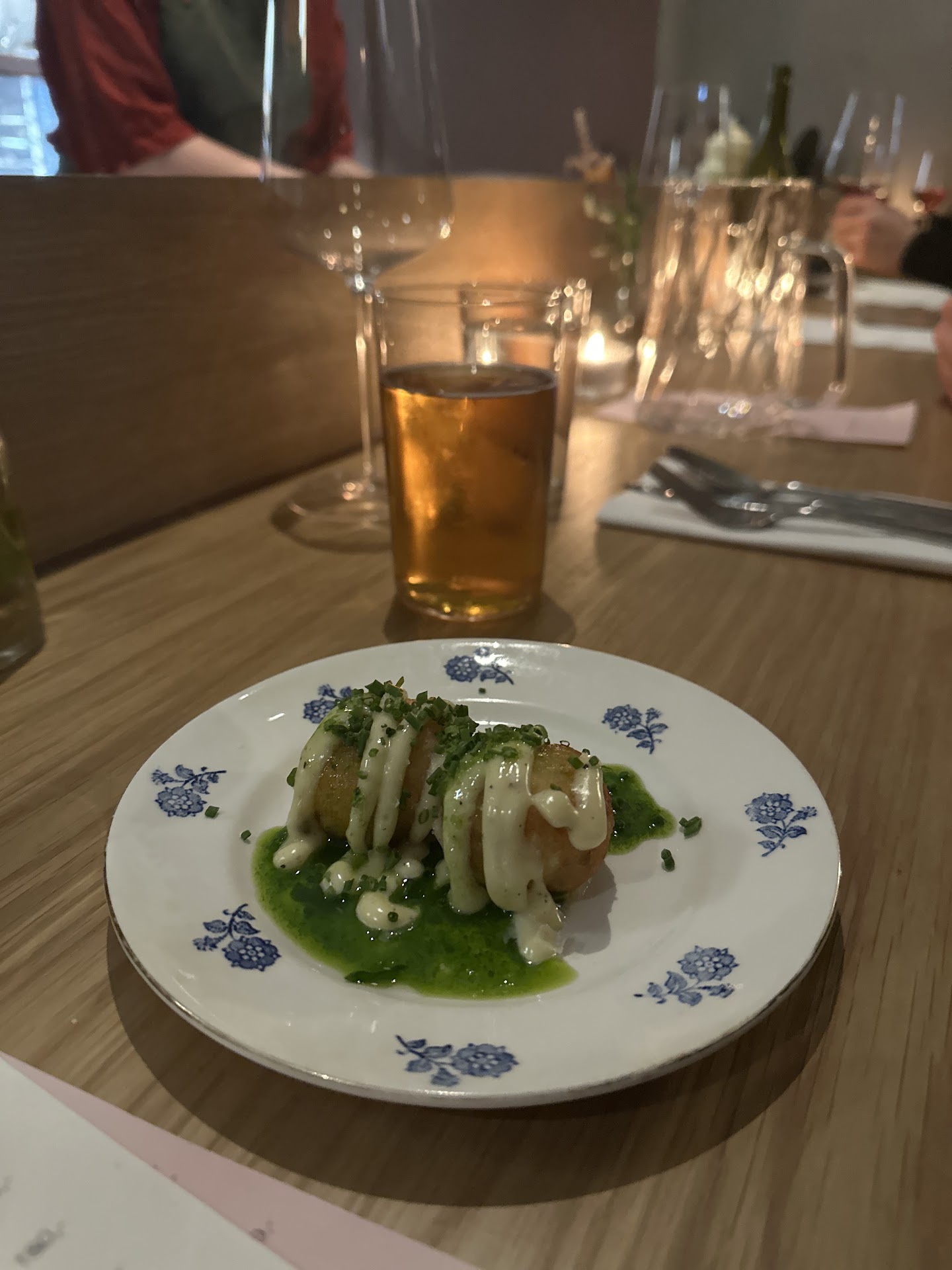 The food: seafood dishes are done well, the scallop dish with coffee infused sauce was a highlight that had an unexpected flavor combination. The pork neck dish was the low point, an utterly tasteless overcooked strip of meat, no salt or anything, and the sauce didn't match well. The other dishes were good but nothing memorable. If you want to have more of the same of the predominant food culture in Oslo these days (years) then you won't be surprised or disappointed.