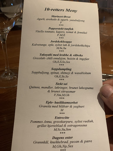 We had the 10-course menu and it was such a fun and flavorful experience! Our favorites were the «Kremet skalldyrsuppe» and «Sprø østerssopp Gochujang», although each dish was unique with wonderful flavor combinations. The whole course felt so thoughtfully put together, and you could really tell the chefs knew what they were doing.
