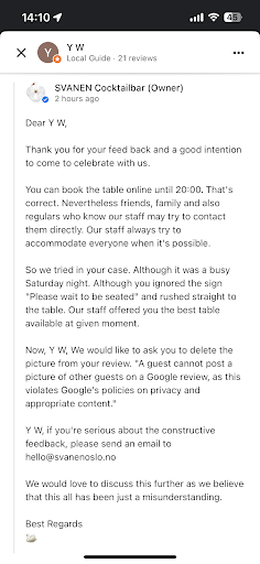 And honestly, Iâve already shared this incident, with documentation, directly via email to your management as well as to the Worldâs 50 Best Director of Content and the Nordic Chair. Venues that mistreat guests this way and then attack them publicly for speaking up do not represent the standards expected of a bar on that list.