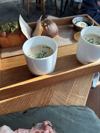 1st course - Soup and Bread Soup, nice and sharp with good flavour and warmth. On reflection it was the best part of the meal. The brioche bread was a little too crispy and burnt. The butter was hard and could have been slightly melted to help with spreading. The crisp bread was unnecessary, a dry accompaniment. The wholemeal roll was slightly better but nothing of note. The dill spread was very lost in the bread course.