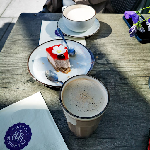 A sunny day is best spent with cheesecake and cappuccino in the very center of Brumunddal.