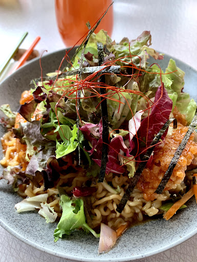 Nice place, cozy, good design, funky, dark, fashion and modern. Came there at 4:30 because i was tired, so nobody was there, which was good for introvert like me. I tried laksa ramen and karaage. If you are a sensitive asian, you immidiate get the greese vibe of hongkong dishes, in a positive way. Lemon cuts on the karaage wasnt consider genius by me. Was really hard and canât squeeze to the chicken. The spice powder on majonese is just for color, you taste nothing. Karaage was greasy, thick, bit stinky, some nice crips and not become soggy. Major was very fatty, creamy. The âbouillabaisseâ noodle was really strong and overly salty. The shrimp with the head on was nice, some fishcakes, a piece of tiny fried air tofu, got 2 shrimp, and some bits of squid. Was nice. I was so hungry but give up the dish almost half unfinished, for the broth was too salty, and jesus i have never ate any ramen, jjamppong, or any European soup that was so heavy the same. I wish it serves with some pieces of lemon, because then it helps refreshing and maybe it could save your dish from embarrassment throw up customers. Rather say iâm still having nightmare of it now. And for such a strong broth, guys you know what, they use so thin noodles, and either itâs so hard to pick up, noodle splashes from easy pull, i have to wipe myself a lot, and i have asian chopstick skills. Imagine some poor Norwegian who still learn to hold chopsticks on their 1500th sushi encounter. Staff probably see i start taking pictures so its not count, but i got a nice one this time from the door walk in. Didnât drink đș Overall it was expensive for just food, concept tries to be creative, but ends up so so, easily pass the eyes of people who never got to get out of Norway to eat smt hella delicious, and would disappointed the most open...
