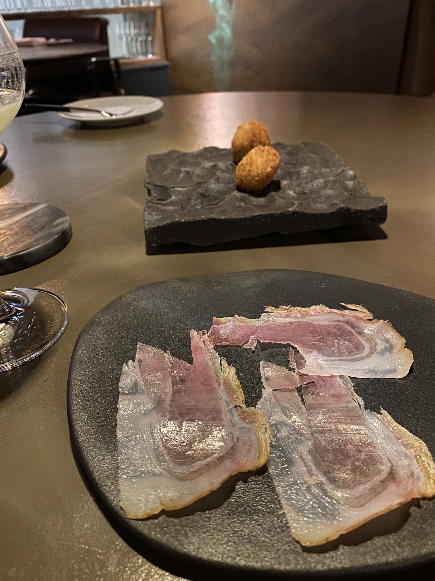 We started with a small snack – cured bacon from an island outside Stavanger. Sliced in slivery thin slices and comparable in taste to great pancetta (maybe even lardo) from Italy. As we had decided to try the wine pairing, we soon got the first glass and it was a nice gesture to leave the bottle on the table.