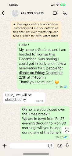 Read moreThe food was okay but expensive. My main concern was that the staff were very cold and the cafe was empty, as if they place was closed. They also turned away a small group of 3 Indian people twice, for absolutely no reason. The old bald man at the bar said "do you have a reservation? Then no." And just walked away from them. I thought it was really rude and it felt blatantly racist because they had no problem with white couples walking in without reservations, or another white man who came at the same time as them. I posted about this on the tromso travel group and the owners wife (blonde woman) liked a comment saying "Indian tourists are the worst." This was really shocking and upsetting to see that the racist motives are confirmed. We felt really bad for the Indian people because they seemed really excited to actually eat there, but the food was basic anyway. Please support other local businesses - this one seems to have a reputation for being cold, racist, and turning customers away for no reason. The empty atmosphere inside wasn't intimate, it was awkward, like you're sitting in a closed down cafe and being served by a waitress in her tracksuit. Not...