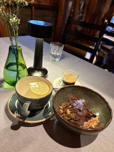 Unexpectedly great food. The initial pictures on Google Maps don't do it justice. We went for the 7 course meal and really enjoyed each dish. The reindeer tartare was a real hit (even if we don't typically eat tartare), and the fish of the day (anglerfish) was excellent. The pea soup was very good, but didn't really have much of a taste (mostly a lot of cream), and the stockfish was fine, but not great. Mostly I think the oil was a bit over-used, and the batter was quite thick and nothing special (a tempura like batter might have gone better and highlighted the fish more). There also wasn't enough of the mayonnaise-like sauce, so you ended up mostly tasting the dough batter. In general they went a bit overboard on the dill (3 of 6 savory dishes had it), but on the other hand the pickled vegetables really added a welcome brightness to the dishes. The wine pairing was also very good, with a surprisingly good Cava and Spanish Txakoli white wine. The Beaujolais was a bit underwhelming, and didn't quite balance with the other stronger flavours (the fish of the day was served with a powerful balsamic reduction), but also not bad. Wait staff were very friendly. I'd rate it at a level of a...