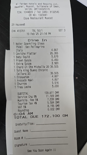 Coya Muscat truly offers a memorable dining experience that stands out in the city's culinary scene. From the moment we arrived, the service was exceptional, with Christine and Hazeem going above and beyond to ensure our evening was flawless. Christine, in particular, was attentive and knowledgeable, while Hazeem was courteous and friendly, though I did have a small issue with him not clarifying the pricing on the gyoza.
