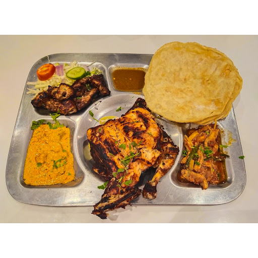 Half Chicken Rost 7-8 pieces of Reshmi Kebabs Chicken Ginger (curry) Chicken Butter (curry) Salad Bbq sauce 4 poori