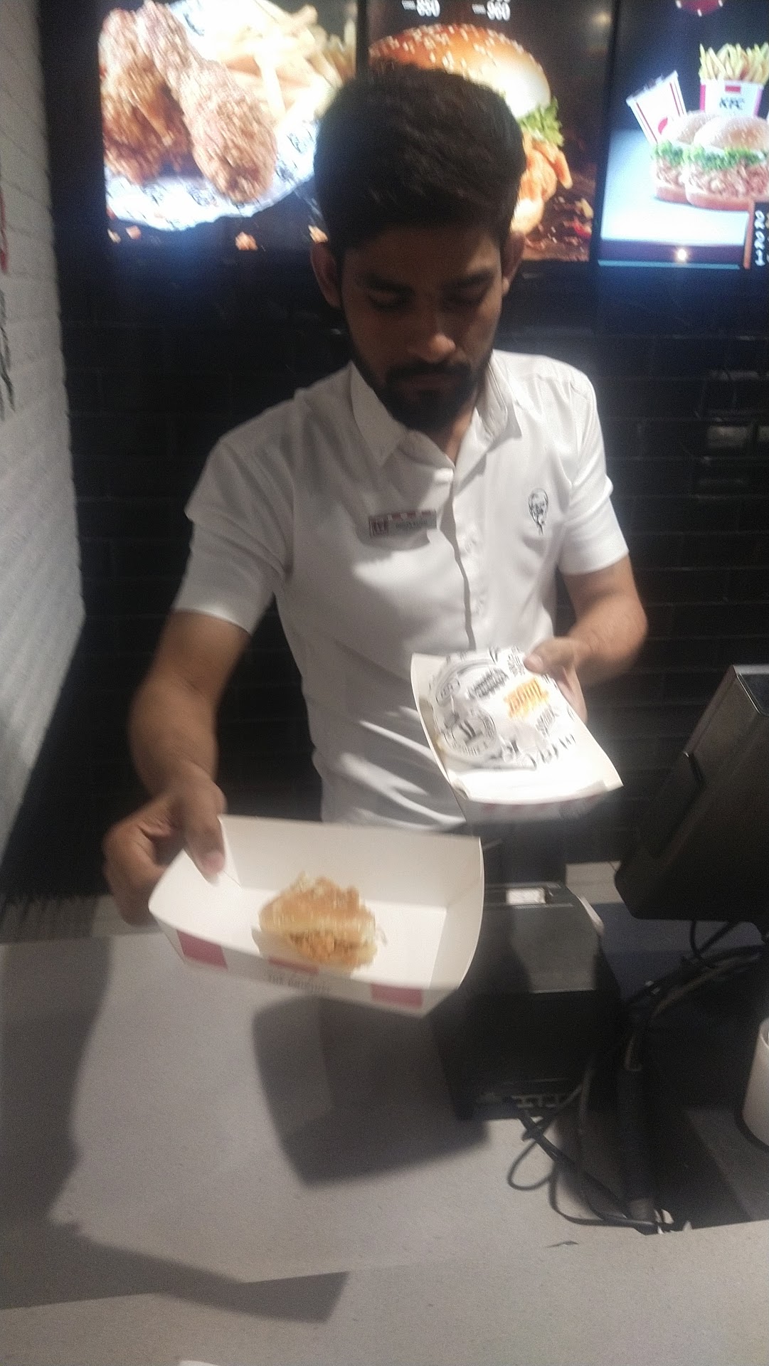 I tried to order 3 signature burgers of KFC i.e. Kentucky Burger, Stacker burger and Messi Burger. Counter staff Rehman informed Burger are not available as they arrive from Karachi in language which shouldn't be used with customers