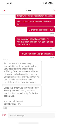 Read moreI would give zero if I could. I had a bill of 550 and accidentally gave 1050 to the rider. Called them but they did not respond, so I called FoodPanda from where I made the delivery. FoodPanda made a 3 way call to subway(malir cantt) and put me through. They told me that will resolve the matter and call me back in 30mins. I never their call. Afterwards next day I called FoodPanda again and went on with the 3 way call, this time they agreed that I will be paid back in full by tonight (Rohaan said this), they asked my phone number and address (which I gave). I never received my money back. After two days I contacted them again and this time the subway correspondent started arguing with me that there was no money that was given in excess etc. And after a long argument did not resolve the problem. FoodPanda compensated for the loss of my money and time. Whereas subway showed zero customer service. It is ridiculous that you guys have zero respect or consideration for a loyal customer....