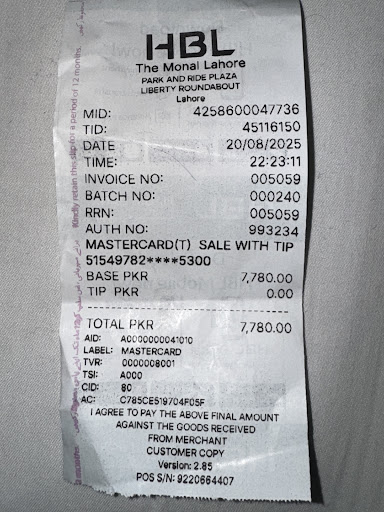 Read moreDear friends I like to share you my feedback about Monal restaurant today Gulburg branch well they have a warm welcome to everyone environment is excellent but too loudly because of people are too loud & have less manners to care about others after 2 year I come back form UK to Visit them they still have only 14-15 food dishes we start with Chinese sweet chicken chilli is not good I left it immediately then chicken chilli white sour is very good then Chinese rice is Nice Not very good then I go for meat without bread & meat taste very well & cooked with curry then after I taken fish & Kabab with Chicken boti in white sauce nice not excellent then I taste Gola Kabab they are the best food on the floor 10/10 , then this time I drink Margareta Drink which is with lime & mint green without Iced I drink 3 of them In my all food before I finish then I complain to manager who promised me He make one more to check how good it is ,you can’t believe it the 4 glass last one was so so nice that I have no world it’s mean the person who is making the drinks he was tired or not happy for his job because of him we are not getting proper food & drinks which is very disappointing well I complain all to manager who promised me they will maintain they food level up and improve there food & drinks other then the price which they asking is too much for just buffet 2-person is 3595 plus tax 370 plus services charges 216 total 🟰 7780/- rupees which is not worth it in this price I eating yesterday on Carnival restaurant they taken 5248/- in total for 2 person buffet & they are really very very good for all I 100% recommended everyone to visit them if they like a good food & in less price & there Margarita...