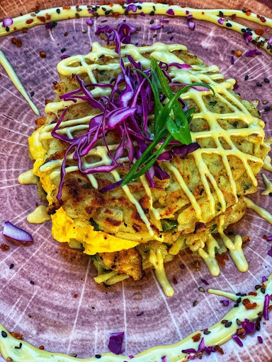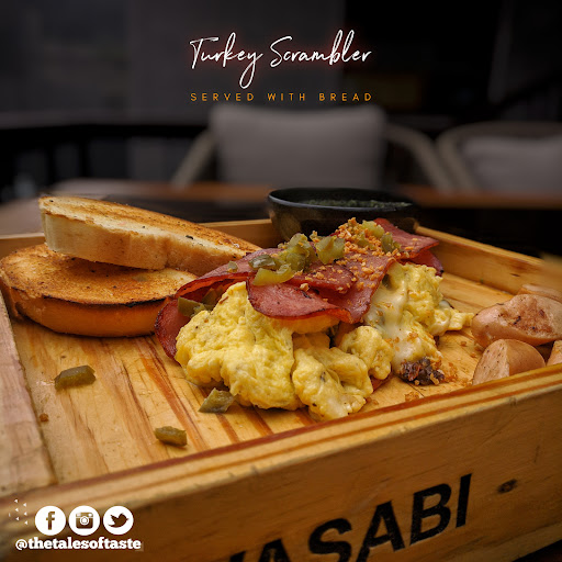The walls of the indoor sitting area are painted grey with red and brown interior and dim yellow lights just add to the overall deep and warm vibes of the place. There's a counter like table where plates and spoons are placed mannerly. This particular section of the restaurant is really aesthetic! The long trails of those yellow LED lights, running along the wall, that only cast their shadowy light on the walls literally have my heart! . Since we were there for breakfast, I opened up the menu to be greeted by almost all the eggy main course and to my surprise, they didn't offer any sushi for breakfast. My taste buds really had some high plans for sushi but life is sad anyways. Hovering over the menu I, as usual, ordered their most expensive omlette, Turkey Scrambler from the chef special menu, while crossing my fingers as my adventures don't always please my taste buds. With a bit disappointment of slow service, I was served my order. I liked their trays to be honest with Wasabi engraved on it. The egg scramble was stuffed in a turkey bacon weave and served with bread and sausages. The bacon strips were delicious and cooked well and the egg scramble was nicely cooked with decent amount of spices and cheese. By the looks of it, you might think you need two of these but believe me if you've finished your tray, you are fully satisfied. I really enjoyed my meal.