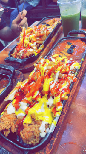 Food? Highly Disappointed 4 little chicken pieces which were so smelly that I could only eat 1 bite each piece (Kinda Dead Chicken). The serving tray in the pictures? 70% of it was filled with french fries, topped with rainbow sauces.