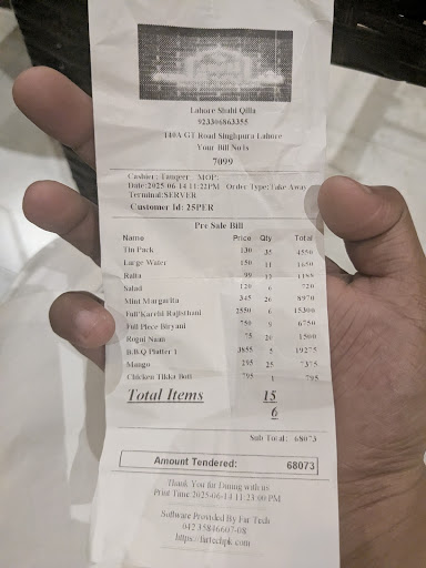 Read moreThe surrounding scenery is not captivating except the Orange Train..the rooftop & interior however have been beautifully designed. Front elevation makes the look of the true fort.. BBQ is excellent. No issues of parking. The staff is professional and polite. Though a number of fast food restaurants are there on this GT Road yet we enjoyed it more here than KFC just opposite to this restaurant. I can recommend it for food lovers...