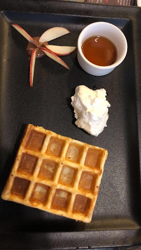 📍The Waffles were perfectly cooked, edges were crispy, a bot cold, Served with one tiny scoop of Vanilla Ice cream , tasted fine but ice cream should have a little more solid.