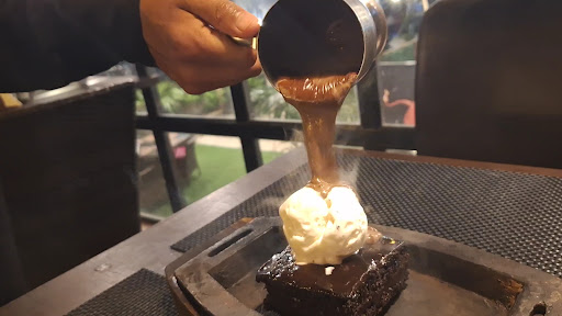 For dessert, we ordered a skillet brownie, which was served piping hot with vanilla ice cream and a cherry on top. At the time of serving, they poured chocolate sauce over it, making it gooey and delicious.