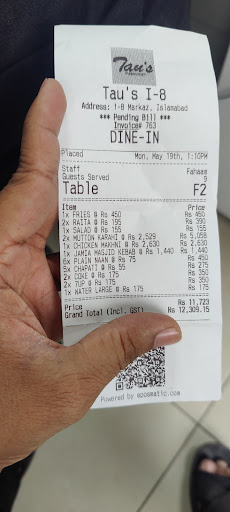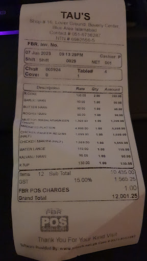 Read moreI have to share our review on #Tau's Restaurant I 8 Markaz Islamabad. The receipt of bill attached. We had ordered a full mutton Karhae. But they delivered a half karhai.. Blaming us that we ordered half . He clearly said at time of order that a full karhae is enough for 5 people. But he intentionally delivered half karhae.. They then presisted us that they will prepare another half in 5 minutes they did so but they charged for 2x half karhae instead of 1x full. 1x full Karhae rate 3950 2x half karhae rate 5058 This was their tactic to get us charged an extra amount. Mr Ahsan floor manager misbehaved us. Very bad mannered staff. Not...