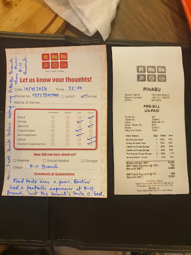 Read moreHad a very tasteless experience at this branch of PiNaBu which i guess has opened recently. Ordered Peri Peri Chicken Naan, Crispy Chicken Naan, 2x Zinger Burgers, 2x California Crispy Burgers but dissapointed with taste of each item. Earlier i had an extremely pleasant experience at PiNaBu F-11 Branch where these all items were extremely tasty. But this Park View Branch has lost my confidence on trying PiNaBu again elsewhere. Famous cold drink was also not available. No sauces were served with the food. Burger patties were tasteless with no bun tossing. On top of all this, waiter gave me bill in advance. Overall i think management issues lacking standard recepies. I feel waste of money. Bill and Feedback copy...