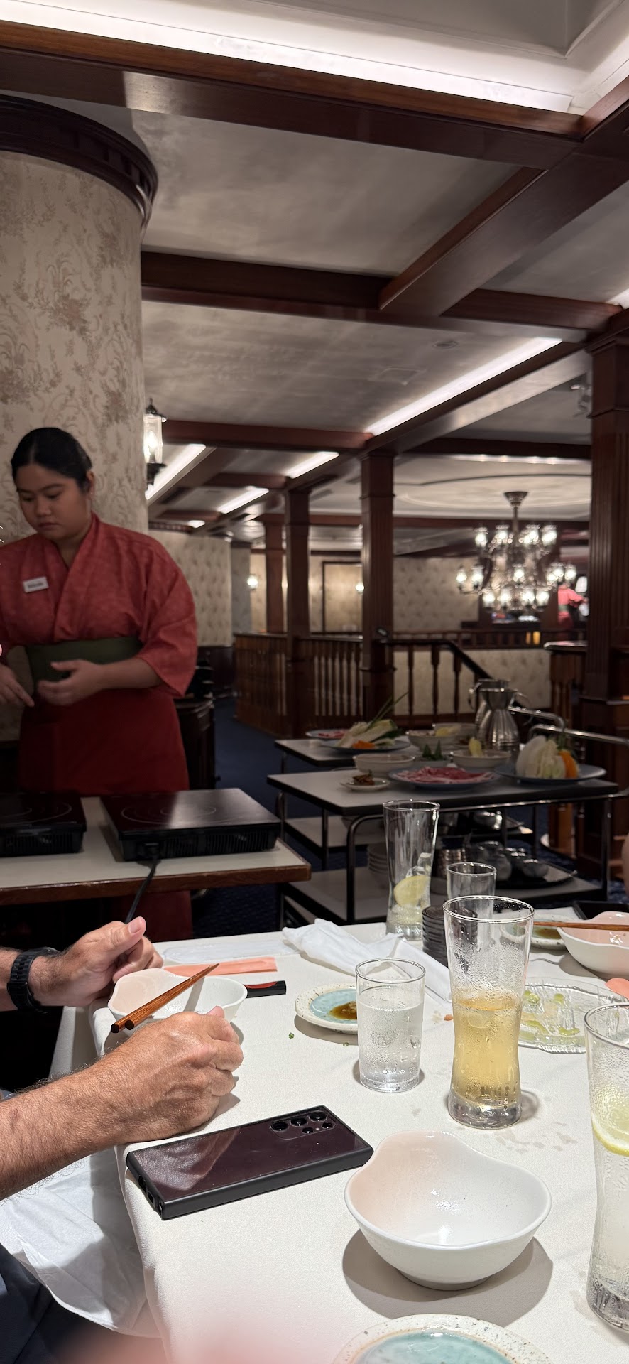The food was wonderful. Our group of six had the hot pot (shabu shabu) options--and a few appetizers. I have limited experience with hot pot, and so I asked the servers many questions. The staff graciously offered to cook our hot pots for us, making the experience much easier for those of us without much experience. The food and pacing was wonderful: we had the wagyu beef and some delicious vegetables and split it all between two people. (Others in our group picked different hot pots that looked equally tasty.) We also tried the spicy tuna crispy rice (I highly recommend it) and some assorted seafood dumplings (also wonderfully delicious).