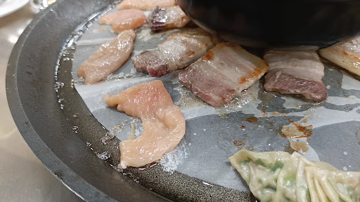 This is basically hot pot without the soup to cook your food. Instead, you are using a heated frying pan. The food options we chose were dumplings, chicken, pork, potato slices, among others.