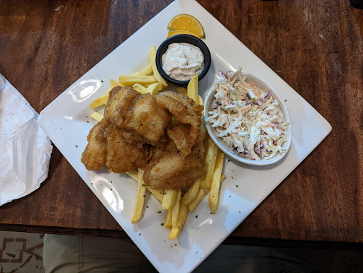 Read moreThe service was excellent but the food was only average. I had the fish and chips and my wife had a hot dog with fries. Although the fish itself was tasty, it was not fried long enough leaving both the batter and parts of the fish too greasy and soggy to eat. The fries on both of our plates were also under fried and lacked seasoning. The place was full of locals really enjoying the live music and with $2 local beer, you can have a good time sitting on the outside patio by the stream. I was impressed that the owner/chef came out and touched tables and there was a lot of cool stuff from around the world...