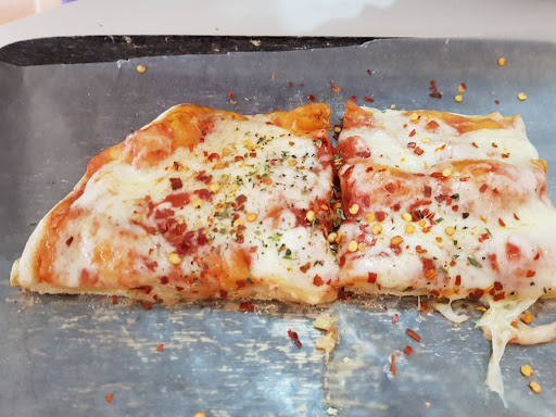 This place makes a good pizza. The dough was a nice mix between tender inside and crispy on the outside (this was a reheated piece they had on display, I suppose the fresh pizza out of the oven has a more supple dough). Not too much tomato on it (which is a common mistake) and the cheese was a good mozzarella. Little flavor but nice and gooey. The pepperoni sausage slices were thin and few. The pizza had no oregano on it but oregano is being offered on the side. First time I see this. I consider this a mistake as the oregano's flavor is brought out by the heat in the oven much better than by the residual heat of the cheese. You get quite a bit of pizza for $8, which they call half a pizza and which is almost as large as a "normal"...