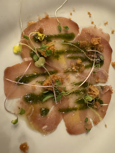 Tuna carpaccio, it was not just âfoodâ but a delightful experience in textures and flavors. The smoked tuna was cut expertly, wafer thin and there was a pesto sauce, âcrumbsâ of very well toasted and flavored bread, sprinkled with sprouts.