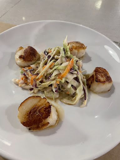 I followed with the scallops which were seared perfectly and was just the right amount for my lighter appetite. My husband ordered the same meal again of the Chicken Parmesan. He ordered a side of Portebello Hash which were pan fried mushrooms which he promptly used over the chicken. He was very pleased again with his choice.