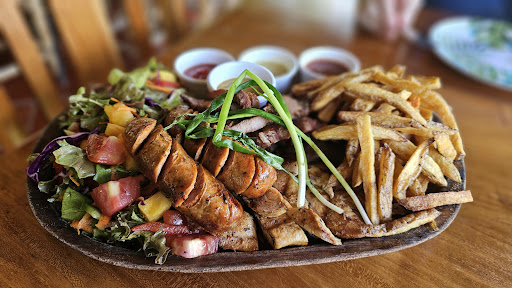 Beautiful surroundings, nature, birds and views. The tables were sticky, glass top tables (if you choose to have these they should be sparking clean! My car windows are cleaner than that!) had smears all over, not appetizing at all. No nachos, so I ordered the tacos, not like the ones I saw on all the pictures of the restaurant. Not filling at all, more like a side dish than a main course! The chicken served with french fries. The chicken had not flavor, bland and unspectacular. The french fries, seemed like they were collected throughout the day and refried for this dish. They were dry and tough! The cocktails were awful. The granadilla mojito, it was not granadilla, but I can also not tell you what it was either. There was no taste of alcohol in it. The rum punch, it was better but really unspectacular. The bar is probably not run by any kind of barman, with any kind of experience on mixing drinks. The water feature was...