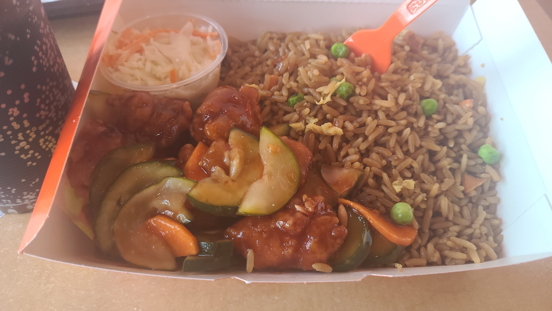 Pedí el clásico arroz frito con pollo, que nunca falla, y además probé un nuevo combo tipo club sándwich que me encantó. Venía con papas y una bebida (limonada), y honestamente me sorprendió lo sabroso que estaba. El combo cuesta como $8, mientras que la porción pequeña del arroz ronda los $5 o $6, así que está bien para lo que ofrecen, aunque sí he notado que los precios han subido un poco últimamente.