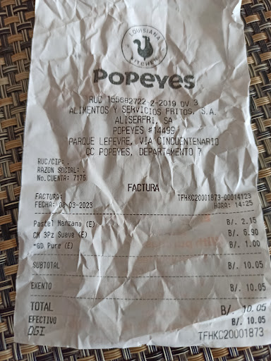 Popeyes es una empresa robusta lastima que no capasite su personal a mejorar la atención cliente obserbe la cajerá con cara de arrogancia atender un cliente 11 pm 29/6/2025 .Balboa .falta de amabilidad , los productos los entregan con chavacaneria no es culpa de la empresa sus empleados no están en forma para despachar comida rápida . Entregan l a soda sueltas si compras varias suelta qué manera de tratara los clientes e viajado muchos establesimiento y muchas beses están conversando en vez de producir Popeyes debe exiguir le más susempleados abeses andan todo mangajo , conosi fueran pollo apanados sus modales tirado por el suelo ese poco importa y la mala educación llevo.bunguer kind desestabilizar Por LA reputación que le dio su personal es una crítica...
