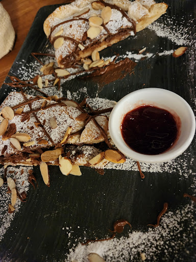 Read moreWe ate:Risotto Zucca E Gamberi, Seafood Risotto, & Nutella Calzone (pictured) for dessert. We sat outside and the atmosphere was lovely, music not too loud. No smoking. Ice water complimentary. Online menu in English for us. Many locals come here. Valet parking right in front. Everything had wonderful flavor. The desert was too big for the 2 of us. I would suggest they offer in 2 or 4 person portion options. We spent about 2 hours here. Slow for North American standards, but we enjoyed our evening here, no other...