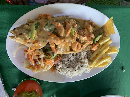 Still dreaming about this food. So fresh and absolutely delicious. Drinks were pretty good too. I wish I could remember what I ordered, but I picked the plate the waiter recommended. It came with a full fish (on the bottom so you can’t see it), shrimp on top, and some other type of fish, covered in some sauce, and for the 2 sides I picked white rice and plantains. It was A LOT of food, I took the rest with me and I finished it the next day. My husband ordered the full fried fish, chose the same sides as I did. All food was fresh...