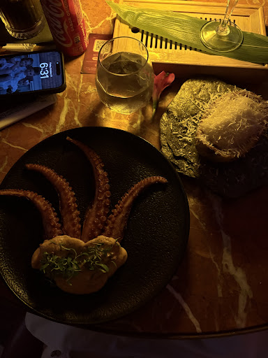 We were given QR codes for the menus and quickly decided on our orders. The cocktails and the first appetizer arrived promptly, followed almost immediately by the second appetizer. The table was so small that the cocktails, water glasses, and appetizers could barely fit, making it difficult to enjoy both the food and the cabaret show.