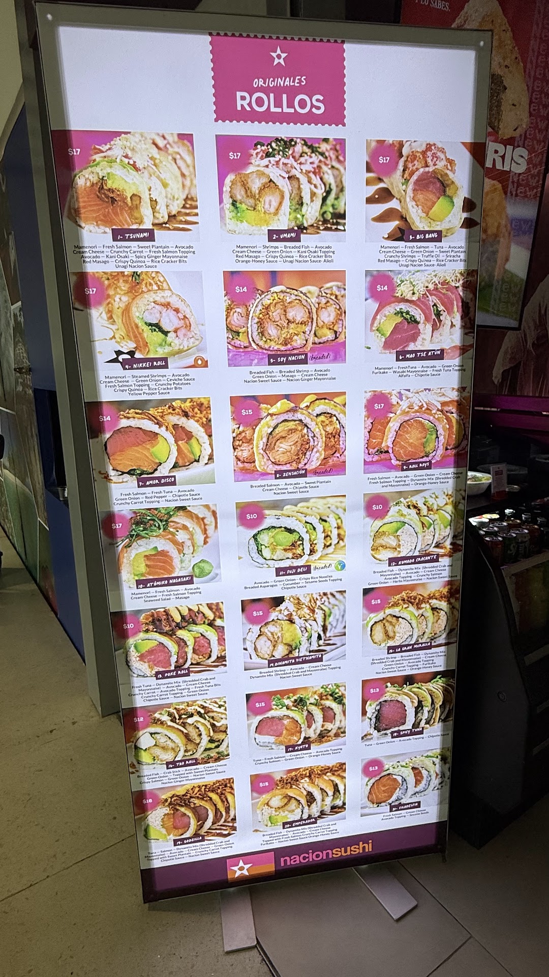 This Nación Sushi is more like a Nación Sushi Express. Its prices are affordable compared to other restaurants at the airport, and the food is good for the price. Since it operates more like an express location, it seems that the sushi is pre-made and frozen, and they simply fry it and serve it, so it really depends on what you're looking for. The restaurant only has nine double seats, so finding a spot to sit can be difficult, but they do offer takeout...