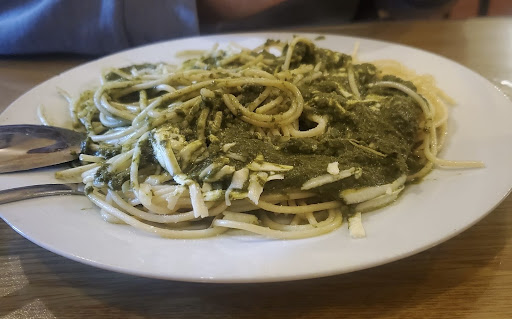 The Pesto Pasta was inedible in my and my girlfriend’s opinions. We are both anti-consumerists and are very conscious of waste, but we couldn’t eat it. The pasta seemed unsalted and the “pesto” seemed to be unseasoned canned spinach which had been blended and had picked up some slight, strange, chemical flavor somehow. The cheese sprinkled on top was fine, but not enough to save the dish.