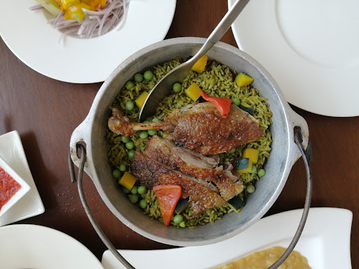 Read moreExcelente ambiente. Las mesas razonablemente distanciadas. Sobre para colocar la mascarilla en la mesa. Personal atento y amable. Pedidos: matambre de cabrito con arroz y frejoles. Porción generosa, el cabrito se deshace en el plato. Viene con Sarsa de cebolla y una porción de arroz. Genial. También pedí el plato bandera, Arroz con pato. Pueden comer dos personas ahí. El pato espectacular, pero el arroz estaba un poco insípido y a mi parecer demasiado graneado. Punto a favor el concolon que se siente en cada bocado. Al final me lleve lo que no pude terminar, y me trajeron un envase a la mesa para servirlo allí, ya que por normas covid del establecimiento, no regresa un plato a la cocina una vez que ha salido. Muy bien. En general es una grata experiencia, aunque los precios son elevados. Ah como aperitivo, algarrobina. No se...