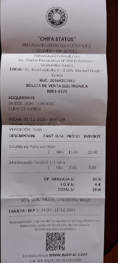 Read moreLocal bueno, pero la comida desagradable. Muy alto costo por los platos que normalmente te cobran menos en otros chifas de calidad. La comida no tiene ese sazón de chifa, más parece arroz con cualquier cosa. La atención regular con un poco de demora. Recomiendo otro local ya que en este cobran muy caro y la comida es pésima. Según a lo que probé en demás chifas. No existe ningún cocinero chino (osea que no habrá sazón china). Bueno eso es mi más humilde y sincera recomendación, me sentí estafado. Psta: Me cobraron S/. 18.00 por una simple tortilla de cerdo (que solo tenia huevo) tamaño de plato. Porción de arroz chaufa con pollo S/. 10.00 Por lo demás la comida no es muy...